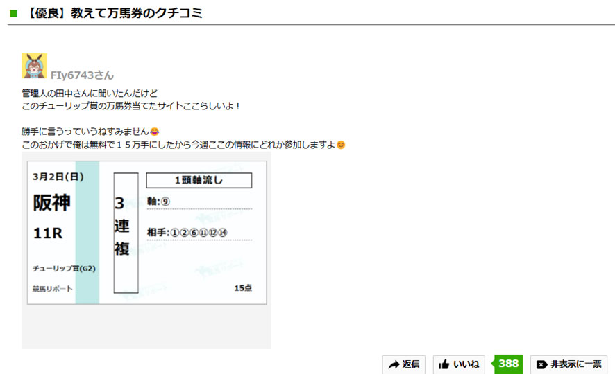 冒頭でもお伝えしましたが、先週のチューリップ賞(G2)の万馬券を的中させたサイトをご紹介したいと思います!