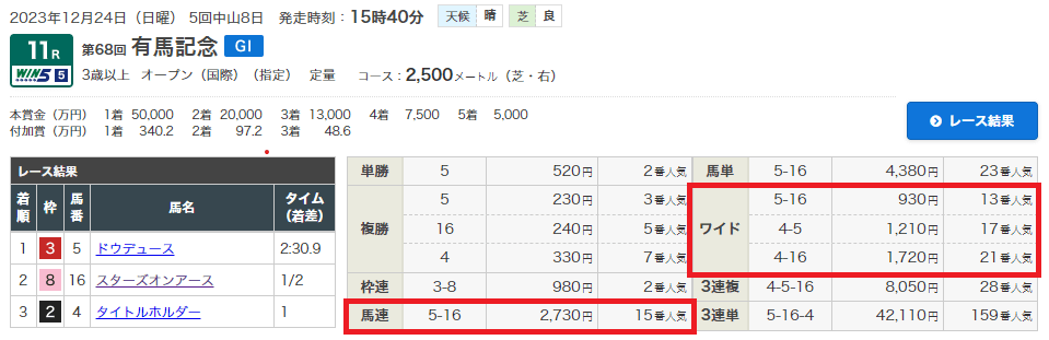 24月(日)中山11R有馬記念(G1)で無料情報2馬券種的中で6万5900円獲得!
