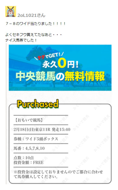 今回の【KEIBA×FAMILY】ではフェブラリーSを当てることができなかったのですが、【おもいで競馬】というサイトでは無料情報が見事的中していたようです。
