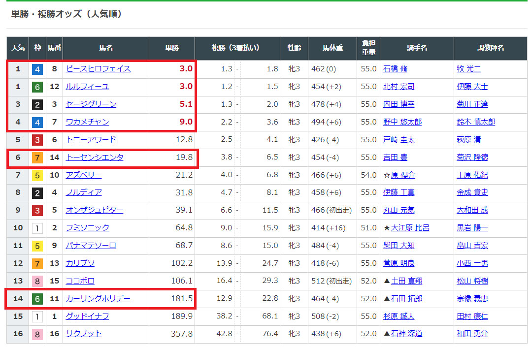 上位人気の馬が中心で選んでいて、1頭だけ14番人気の大穴馬が選ばれていますね。
