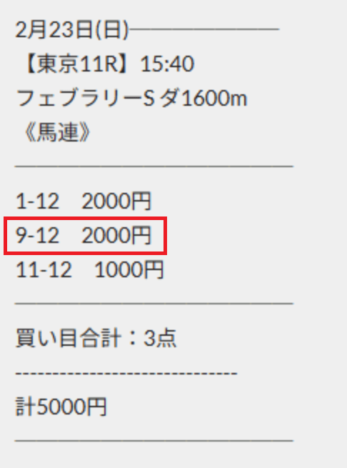 ⑨-⑫で馬連的中!仮に馬単で買っていても的中で5万9400円!