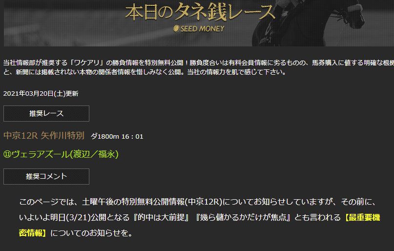 サイト内をくまなく探索すると3月的中12本と的中本数が少なすぎる、今現在216レース行われて的中率を割り出すと5.6%、正直自分で予想した方が…と、なってしまいます。