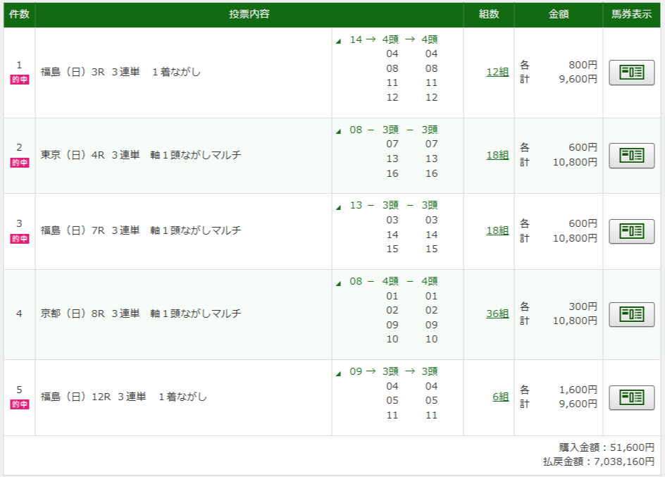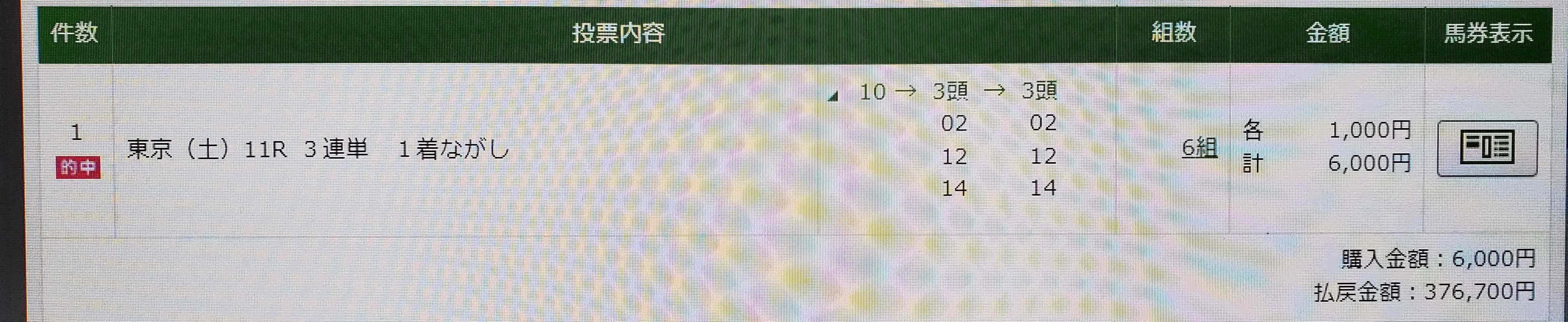 1点500円で馬券買っていたから一撃18万4800円獲得、地味に荒れたから的中嬉しすぎます。