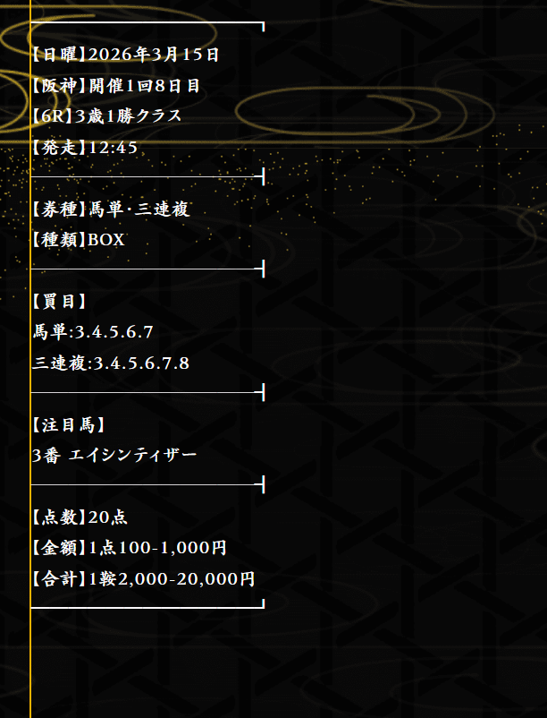 中山4Rの予想は1万3200円とそこまで配当高くなかったけど続く阪神8Rの予想では7万9200円とめっちゃ満足!