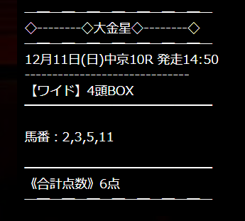 サイト名大黒星にでもしてください。 ワイドまったく見当違いな買い目でした。 当たらないですね。