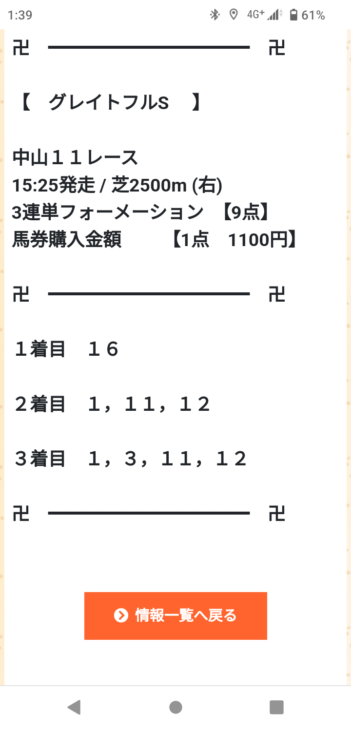神器奉納!!2週連続提供¥50,000.... 参加してますがマジ的中しない!! ここは情報無いし、完全悪徳だよ。 一応土曜日の買い目です。全然惜しくもない買い目です。