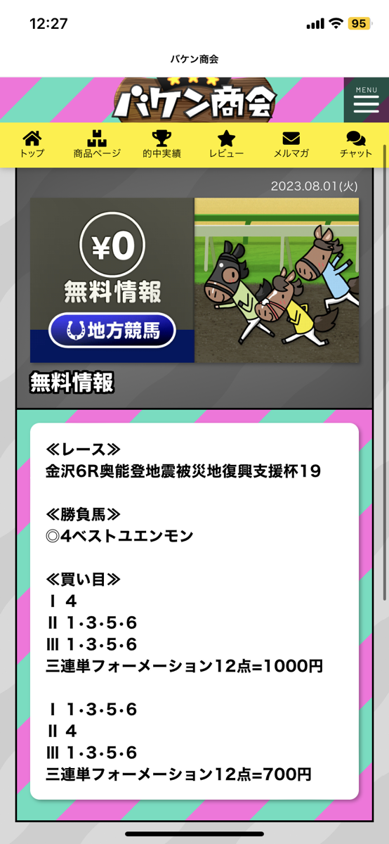 7月4日(火)無料情報【盛岡5R】で3連単59.7倍的中で払い戻し「5万9700円」貰えました!