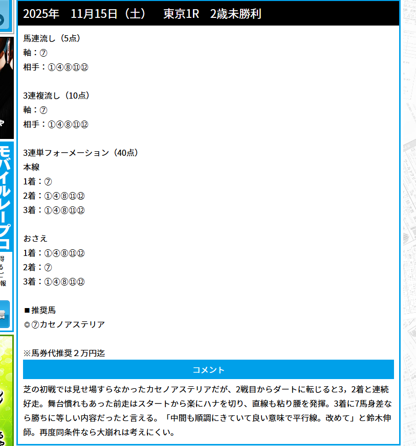 配当狙って3連単1点狙いで無料予想使って正解でしたわ! 馬券代2万円推奨だったので1点500円点数40点で2万円に合わせて利用しました。結果は馬連も3連複も3連単も当たり、唯一馬券買っていた3連単のオッズは317.4倍も付いてくれたおかげで馬券代2万がかすみますね!!! 推奨通りの購入で15万8700円払い戻しでした、朝一発目のレースからこんな的中もらえると痺れますね!