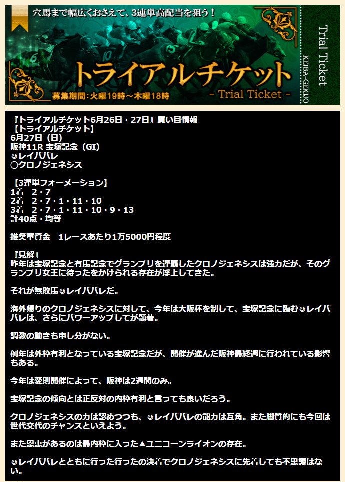 ユニコーンライオン【7人気】を押さえていた点はさすがですね。 1人気、2人気がバリバリの人気だったから配当は美味しくはなかったけどこの的中精度は継続して利用する価値がありますね。 他の有料級に値する情報だと感じました。